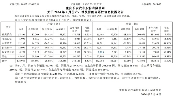 3月6日,长安汽车发布产销快报显示,2月长安汽车销量为152704辆,同比下降20.05%;其中,自主品牌新能源销量为23266辆,同比增长12.87%。