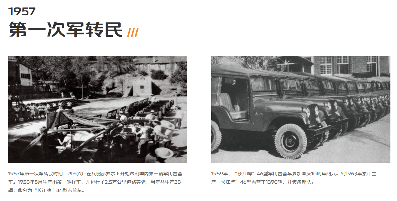 相较于一汽、东风的白手起家,起源于中国最大兵工厂之一的长安汽车便显得家底深厚。在东风轿车、红旗高级轿车诞生同年,长安汽车也生产了中国第一辆吉普车——长江牌46型吉普车,随后于1984年生产出中国第一批小型汽车,正式进入汽车领域。