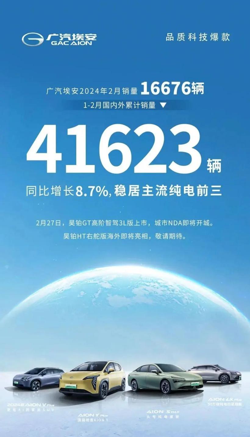 在理想与问界角逐“销冠”时,曾经的“老大哥”埃安严重掉队,2月销量仅16676台。埃安销量大幅滑坡也在意料之中,越来越多的纯电紧凑型轿车/SUV进入市场后,埃安的先发优势不再,加上网约车市场趋于饱和,广汽埃安交付量难以保持高速增长。