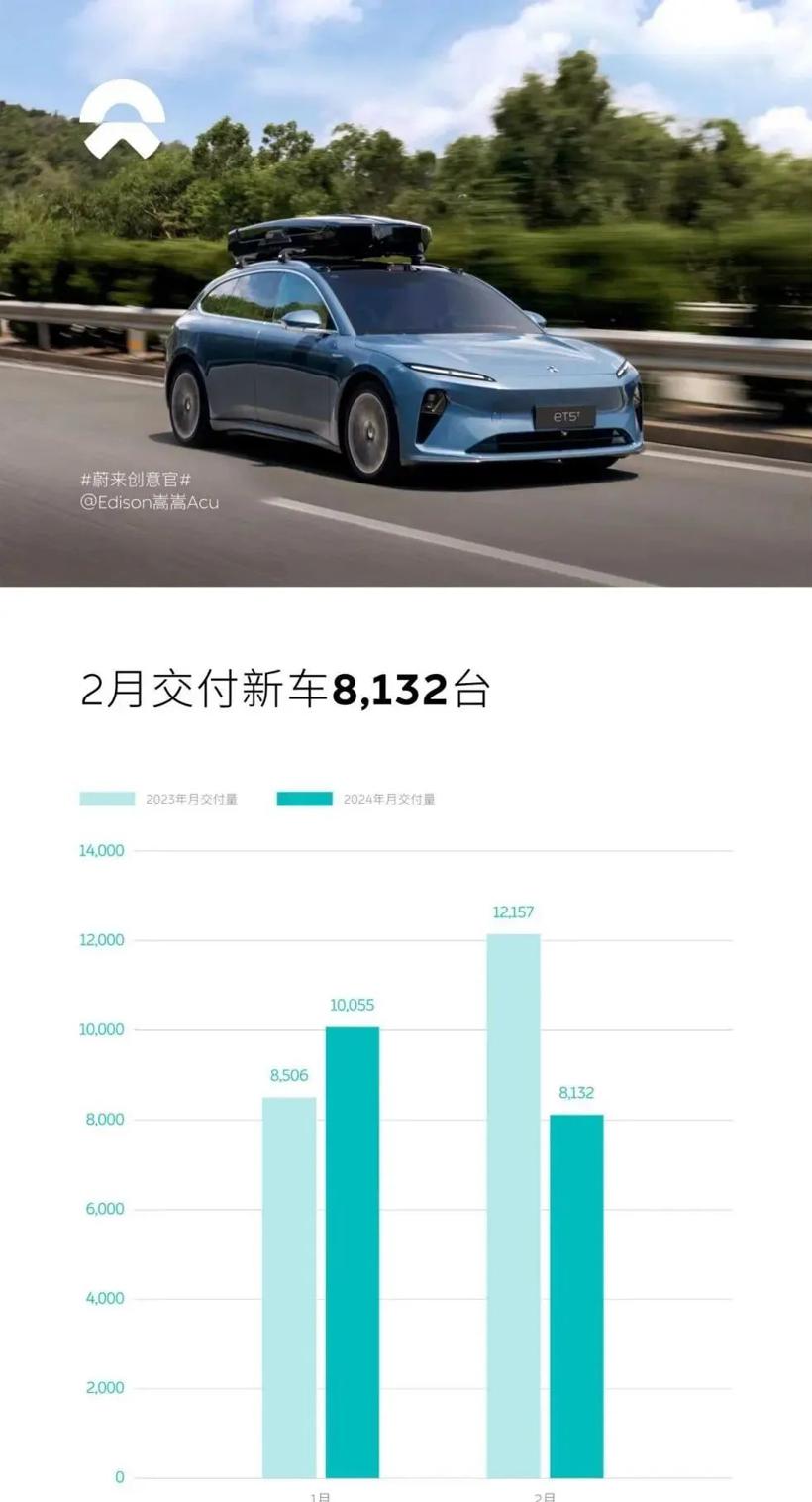 蔚来汽车2月交付量为8132台,不足理想交付量半数,略高于极氪。