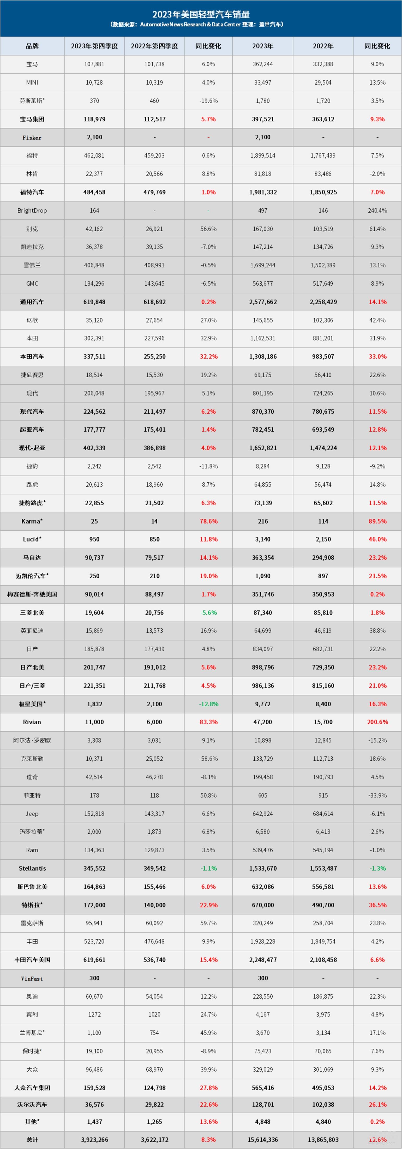 根据Automotive News Data Center和GlobalData发布的数据,2023年第四季度,美国新车销量同比增长8.3%,达到约392万辆,其中仅在12月的销量就同比增长16%,达到149万辆,远高于预期。最终,美国车市2023年全年以“1560万辆、同比增长13%”的销量数据收官。