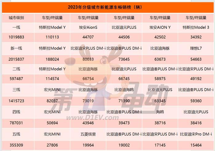 2023年城市新能源车终端销量榜:三线及以下城市被五菱和比亚迪“霸占”