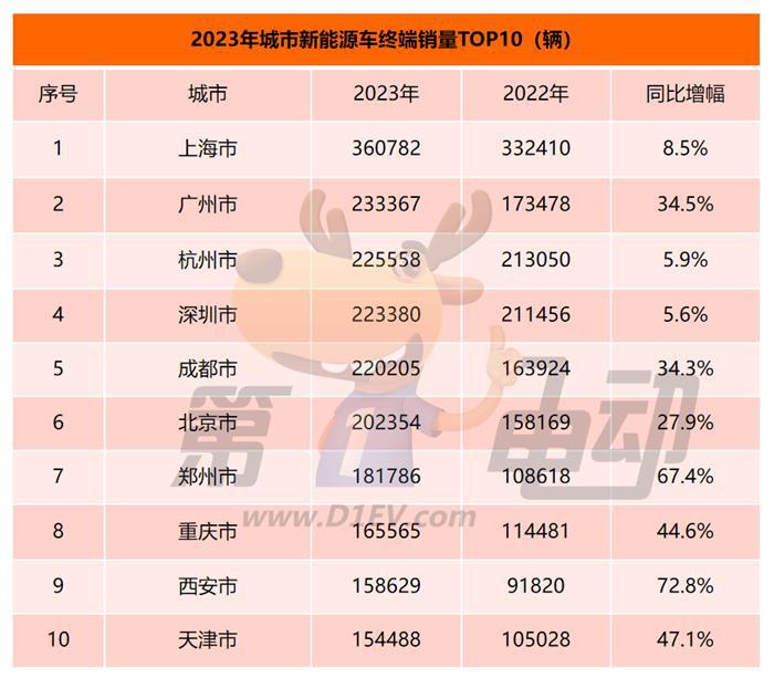 同比增幅来看,2023年进入榜单前十的城市同比均实现不同程度的上涨,其中西安涨幅最大超72%。其取得如此成绩,一方面,得益于比亚迪和吉利新能源的高速增长;另一方面,西安给予了新能源车消费补贴,总金额为1.5亿元,每辆车最高补贴5000元。