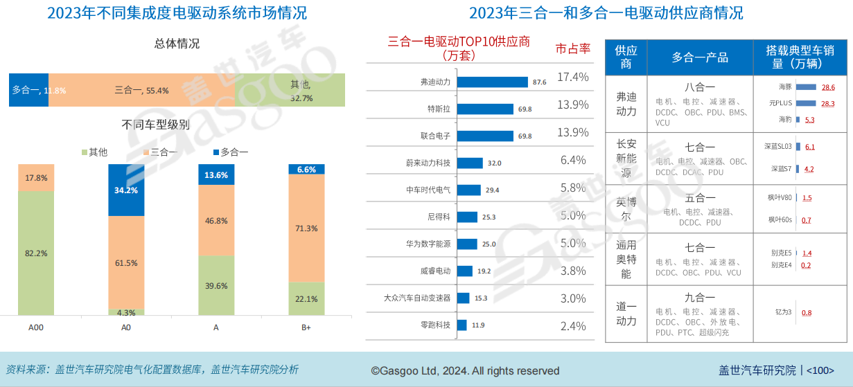 慧选车集研究院观察到,目前结构紧凑、更利于整车布置的三合一电驱动系统已成为主流产品。2023年,国内乘用车市场三合一电驱动系统配套份额55.4%。