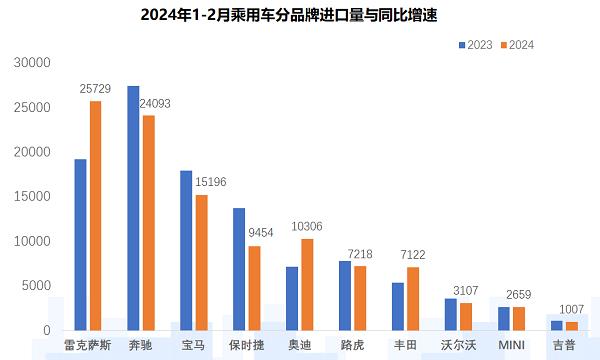具体来看,在前十大品牌中,雷克萨斯、奥迪、丰田、mini四个品牌在1-2月实现正增长。其中奥迪和丰田的销量持续上升,涨幅分别达到44.3%和32.9%,雷克萨斯排名第一,其销量为2.57万辆,同比上升34.1%。