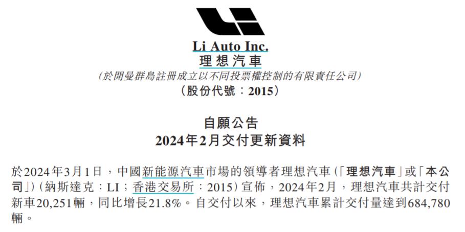 3月1日午间,慧选车集获悉,理想汽车在港交所发布公告:2024年2月,理想汽车共计交付新车20,251辆,同比增长21.8%。