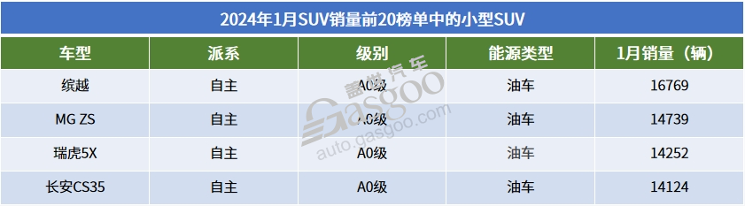 国内小型SUV市场目前已经完全由自主车型主导了。1月共有5款小型SUV销量破万,全都是自主产品,其中有四款都冲进了SUV月度销量前20榜单。