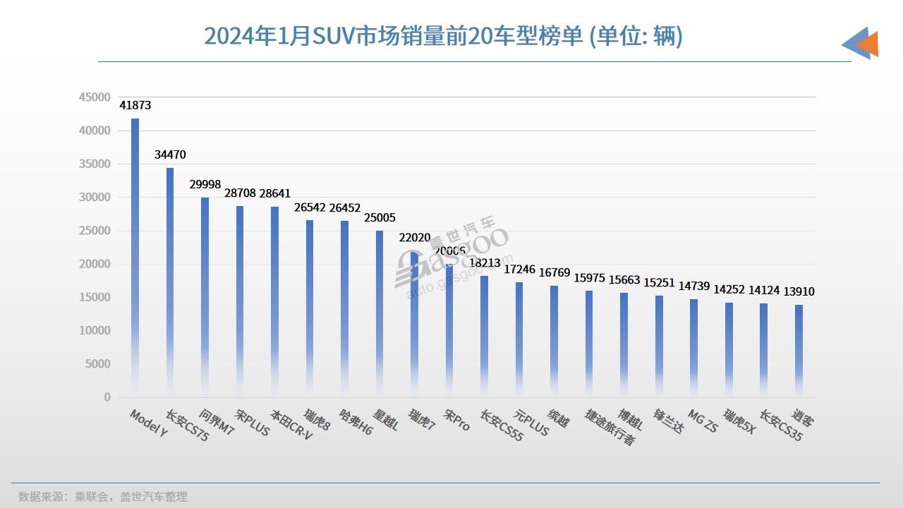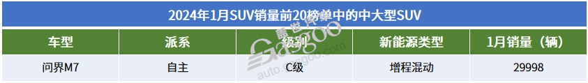 2024年1月SUV销量TOP20:自主集体发力,问界M7月销近3万辆