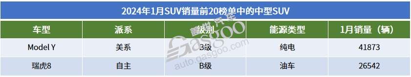 1月的国内中型SUV市场整体格局变化不大,特斯拉ModelY依旧是细分市场上的销冠,也是整个国内SUV市场上销量最高的车型。另外一款进入SUV销量前20榜单的中型SUV也是熟面孔,奇瑞瑞虎8,继续充当着奇瑞整体市场表现高歌猛进过程中的急先锋,1月销量超过了2.6万辆。