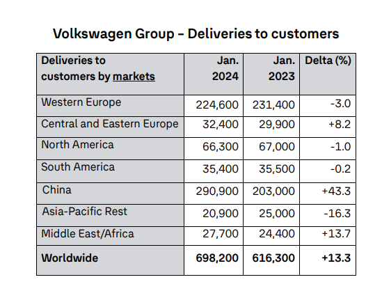 中国市场大增43%,大众集团1月全球销量迎开门红