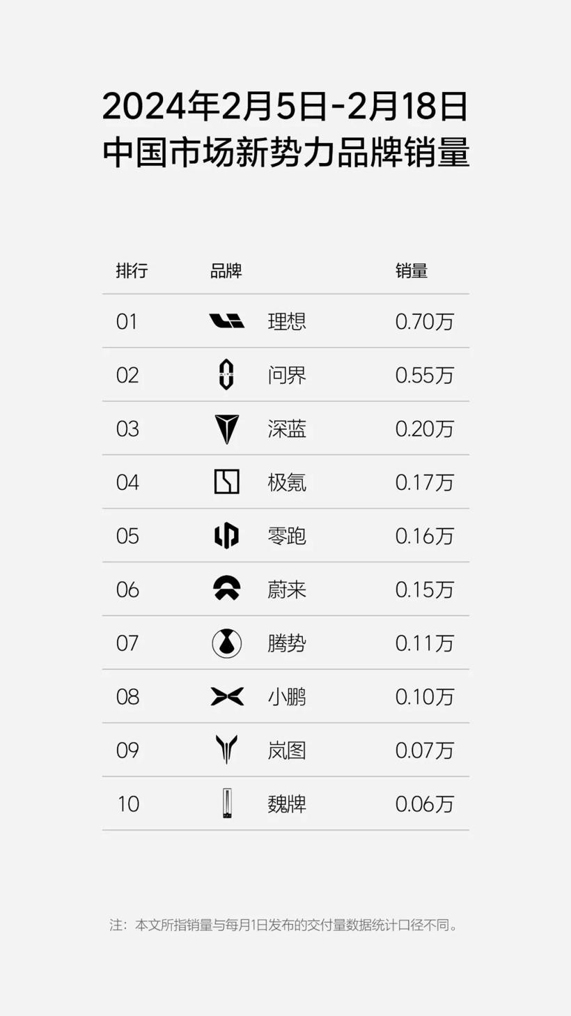 不过值得注意的是,在今年第6至7周(2.5-2.18),理想汽车双周销量0.7万辆,位居新势力品牌销量榜首。同期,在中国市场豪华品牌双周排行榜中,理想汽车位居第五,是榜单中排名最高的中国品牌。