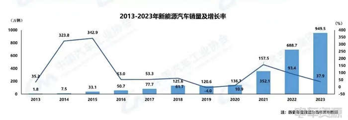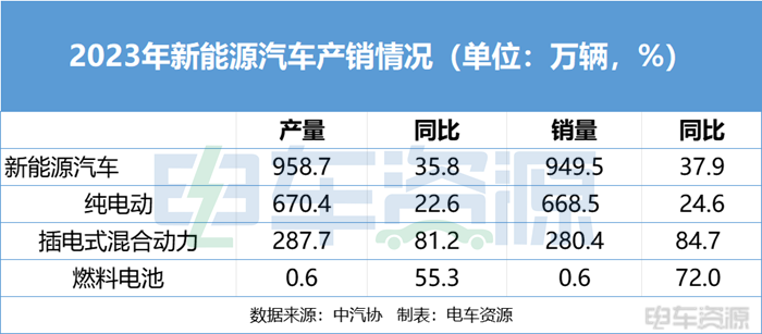 2023年全年新能源汽车产销分别完成958.7万辆和949.5万辆,同比分别增长35.8%和37.9%,市场占有率达到31.6%。其中,国内销量829.2万辆,同比增长33.5%,新能源汽车出口120.3万辆,同比增长77.6%。