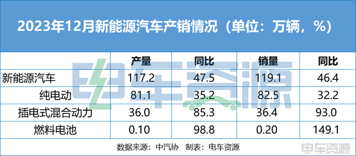 其中,12月新能源汽车产销分别完成117.2万辆和119.1万辆,同比分别增长47.5%和46.4%,市场占有率达到37.7%。其中,新能源商用车产销分别占商用车产销的17.4和17.5%。