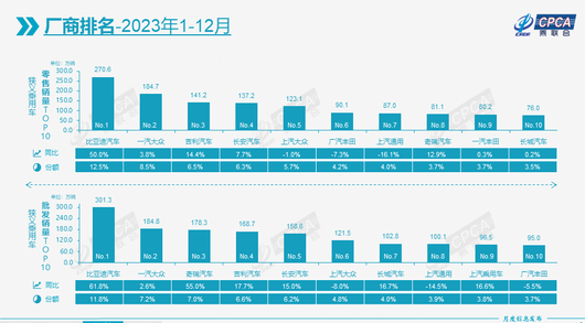 2023年车企销量的冠亚军还是比亚迪和一汽-大众,但两者之间的体量已完全不同。