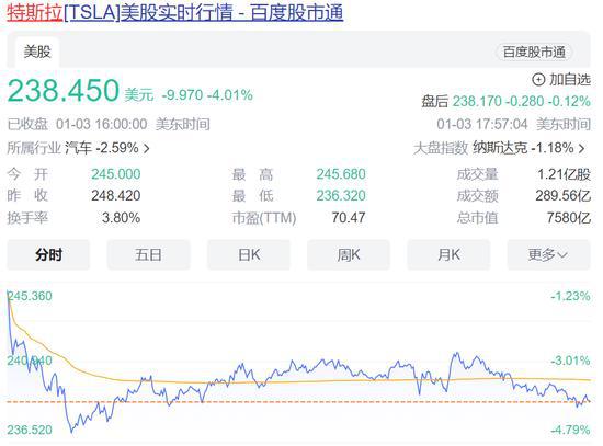 截至当地时间1月3日收盘,特斯拉股价报收238.45美元,跌超4%。总市值7580亿美元,一夜蒸发了324亿美元(约合人民币2317亿元)。